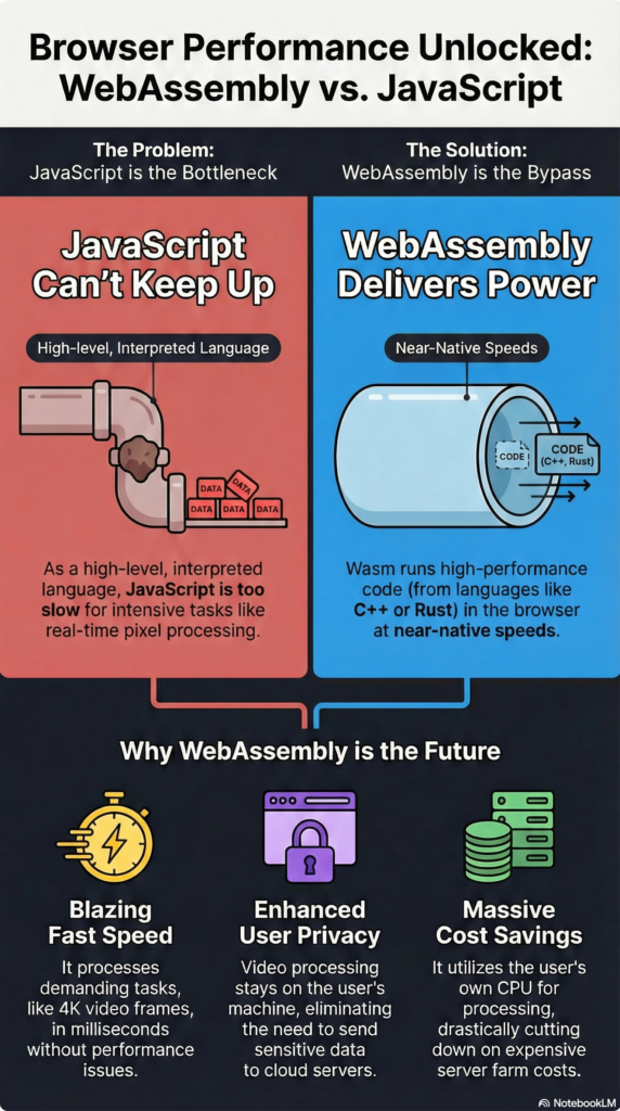 Here’s the deal: JavaScript is a high-level language. It’s interpreted. It’s “flexible,” which is just a nice way of saying it’s slow when things get intense. When you’re talking about WebAssembly for real-time video processing, you’re talking about bypassing that sluggishness entirely.